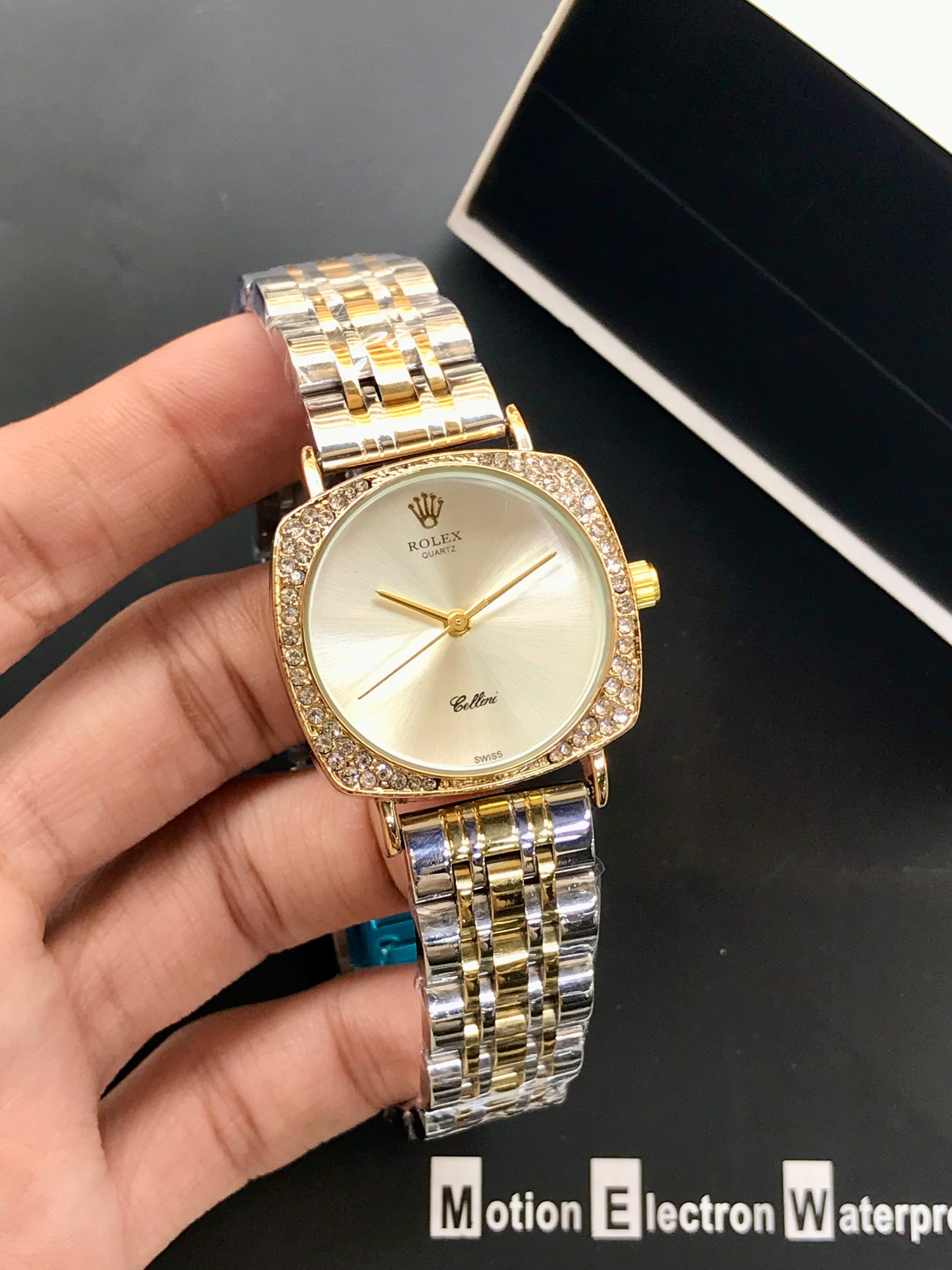 Step into elegance with the Rolex Cellini Quartz Luxury Watch, designed for those who demand both luxury and precision. The off-white dial, encircled by a crystal-studded bezel, reflects sophistication, while the two-tone gold and silver bracelet adds a touch of modern style.