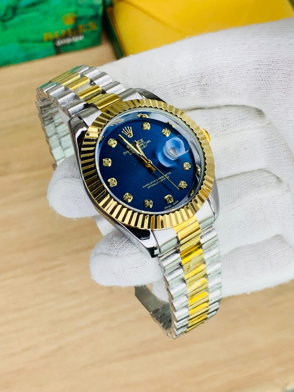 Elegant and iconic, the Rolex Datejust with a striking blue dial pairs timeless design with modern sophistication. Its stainless steel case, fluted bezel, and signature date display reflect refined craftsmanship. A perfect blend of prestige and performance for any occasion.